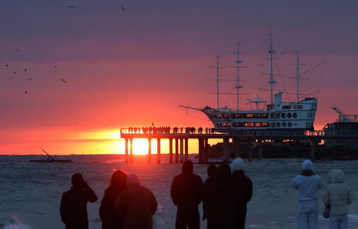 | ▲ 해맞이 명소 강원 강릉시 강동면 전동진 해변에서 관광객들이 일출을 보고 있다.(사진: 연합뉴스) |
