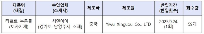 식품의약품안전처는 수입식품 등 수입·판매업체인 ‘시엔아이’가 식약처에 수입신고 하지 않고 ‘타르트 누름돌’을 국내에 반입·판매한 사실이 확인됐다고 19일 밝혔다.