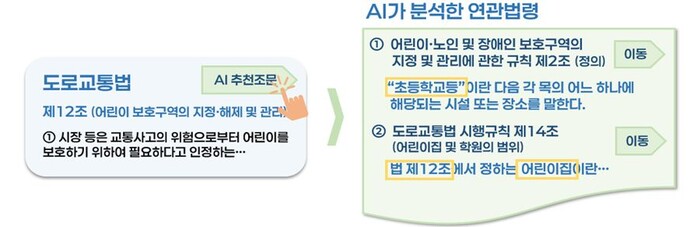 예를 들어, 어린이 보호구역과 관련된 「도로교통법」 제12조가 검색 결과로 나왔다면, AI가 해당 조문과 연관성이 높은 「어린이·노인 및 장애인 보호구역의 지정 및 관리에 관한 규칙」, 「도로교통법 시행규칙」 등의 관련 조문을 함께 보여준다.