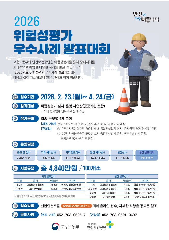 [매일안전신문=김진섭 기자] 고용노동부와 한국산업안전보건공단이 2월 23일부터 4월 24일까지 ‘2026년 위험성평가 우수사례 발표대회’ 참가기업을 모집한다.