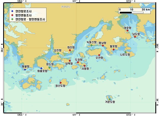 [매일안전신문=김진섭 기자] 국립해양조사원 남해해양조사사무소가 8월 말까지 남해안 서부(해남에서 고흥 인근)에 있는 17개 주요 항만(무역항 1개, 연안항 6개, 국가 어항 10개)을 대상으로 항로조사를 한다.