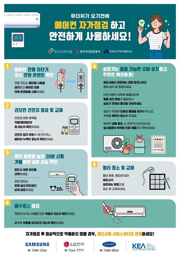 소비자는 에어컨 제조사 홈페이지나 사회관계망서비스(SNS) 등에 게시된 '에어컨 자가 점검' 체크리스트로 이상 여부를 먼저 확인하고, 전문가 점검이 필요한 경우 제조사에 서비스를 신청할 수 있다.