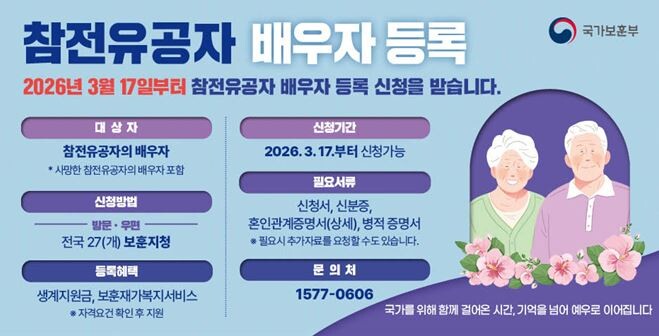 해당 시행령 개정에 따라 참전유공자 배우자 등록신청은 오는 17일부터 본인 신분증과 참전유공자의 병적증명서, 혼인관계증명서 등을 지참하여 주소지 관할 보훈(지)청에 방문하거나 우편을 통해 접수할 수 있다. 다만, 거동이 불편하거나 보훈관서 방문이 어려운 경우 신청인의 위임을 받은 대리인 신청도 가능하다.