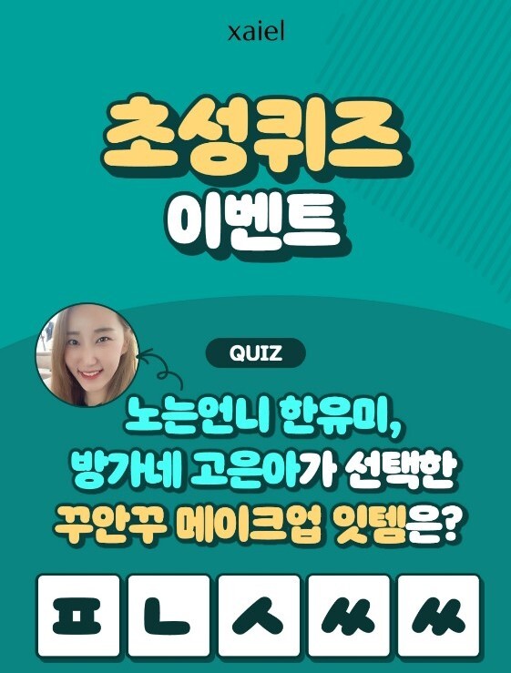 자이엘 선CC 이벤트는 "노는언니 한유미, 방가네 고은아가 선택한 꾸안꾸 메이크업 잇템은? ㅍㄴㅅㅆㅆ" 이 문제로 나왔다.