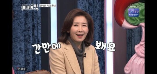 나경원 전 의원이 스튜디오에 등장하자 모든 MC들은 "예쁘다" "원래 연기자 했어야 했다" "서울대 퀸카 아니냐"며 감탄했다.