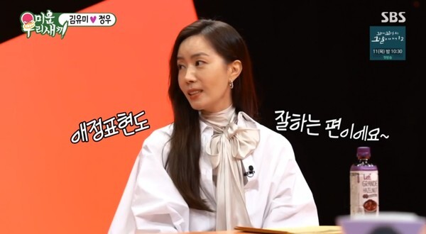 김유미는 정우와 결혼 6년차라고 밝혔다. 서장훈은 "실제로도 정우 씨가 그렇게 사랑꾼이냐"고 물었다. 이에 김유미는 "표현을 잘하는 스타일이긴 하다"며 "마음 속에 담아두지 못하고 그때그때 다 말하는 스타일이라 애정 표현을 잘하는 편"이라고 답했다. 그러면서 김유미는 "정말 재밌다"며 "웃다가 그냥 막이 걷어졌다"고 말했다.