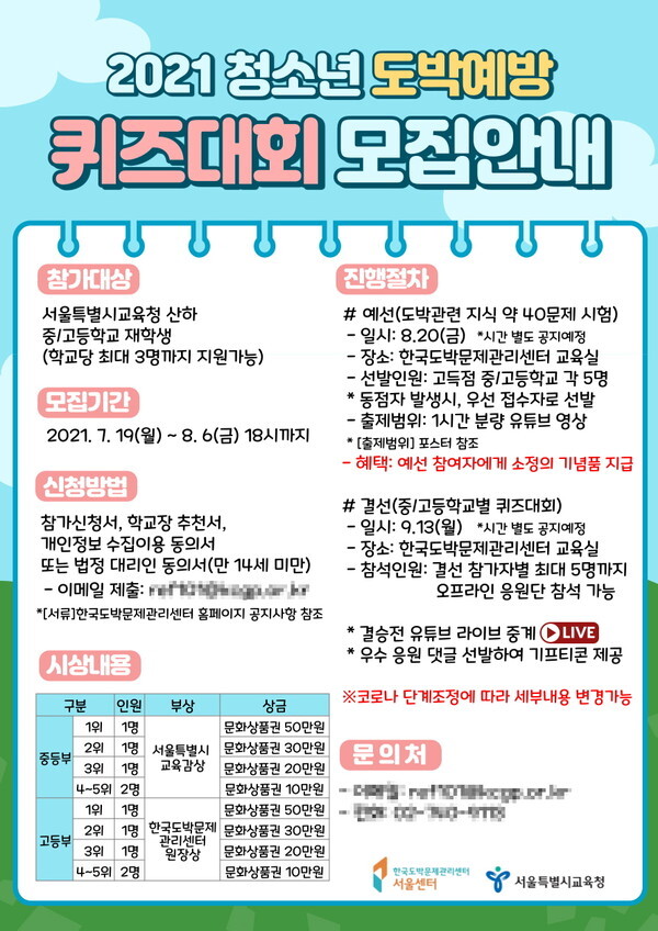 서울특별시교육청(교육감 조희연, 이하 ‘교육청’)과 한국도박문제관리센터 서울센터(센터장 신행호, 이하 ‘서울센터’)가 7월 19일부터 8월 6일까지 ‘청소년 도박예방 퀴즈대회’의 참가자를 모집한다고 19일 밝혔다.